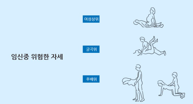 직접 결합방법이 아니고서도 서로의 만족과 사랑을 교환할 수 있으므로 서로 따뜻한 이해와 부끄러움 없는 행동과 협조가 필요 합니다. 너무 지나친 여성 성기의 자극은 피하는 것이 좋고 유방에 대한 애무는 유산, 조산의 징후가 있을시 외에는 산후 수유에 오히려 좋다고 되어 있습니다. 임신중 손을 질속 깊숙히 삽입하는 것은 염증의 가능성이 있어 좋지 못하며 뒷물도 너무 심하게 하지 않는 것이 좋습니다. 임신을 하게 되면 성 관계를 지속할 수 있는지에 대해 궁금해하시는 분들이 많습니다. 임신 중에도 충분히 성생활이 가능하며 성생활이 임신에 직접적인 악영향을 끼치지는 않습니다. 다만 주의해할 것들이 있는데요. 임신 중 관계시 꼭 알아야 할 시기별 가능한 자세와 금지 자세 등에 대해 알아보겠습니다.