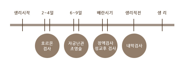 난소의 기능과 배란에 관여하는 호르몬 상태를 알기 위해 생리 시작 2~4일 사이에 시행하는 에스크로젠, 난포 자극호르몬 검사와 황체 기능을 알아보기 위해 배란 후 1주경에 시행하는 황체 호르몬 검사 등이 있습니다. 이 외에도 유즙 분비 호르몬 및 갑상선 기능 등도 검사를 하게 됩니다.